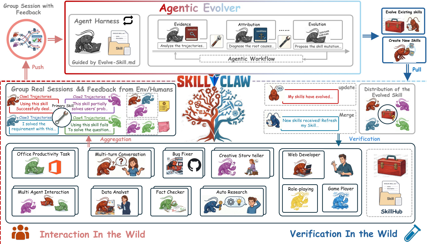 • The paper introduces SkillClaw, a framework designed for collective skill evolution within multi-user agent ecosystems. This framework enables the continuous transformation of interaction trajectories into shared evidence to facilitate system-wide capability growth.