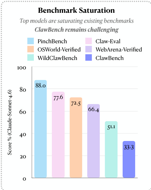 To evaluate the ability of AI agents to automate routine life and work activities, the researchers introduce ClawBench, an evaluation framework comprising 153 tasks across 144 live platforms that utilizes a lightweight interception layer on production websites to preserve real-world complexity, revealing that frontier models struggle with these dynamic workflows and achieve low success rates, such as 33.3% for Claude Sonnet 4.6.