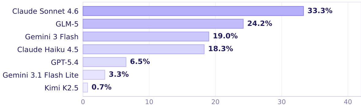 The authors evaluate seven frontier models on the CLAWBENCH benchmark, which assesses AI agents on real-world web tasks. Results show that the top-performing model achieves a success rate of 33.3%, with significant variation across models and task categories. Claude Sonnet 4.6 achieves the highest success rate among the evaluated models. Performance varies widely across models, with the top model outperforming others by a substantial margin. Model strengths differ by task category, indicating uneven competence across domains.