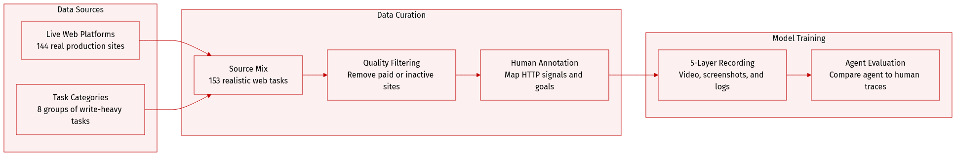 Task Details and Filtering: Each task is defined by a natural language instruction, a starting URL, and a specific terminal submission target at the HTTP request level. To ensure quality and usability, the authors applied a multi-stage filtering pipeline to remove tasks involving paid subscriptions, geographically restricted services, or websites that are no longer active. Human annotators were used to instantiate realistic goals and verify that every task remains completable and reproducible.