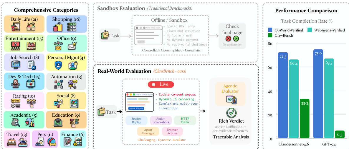 As AI agents move toward automating routine life and work tasks, they must navigate the complexities of real-world web environments. Existing benchmarks often rely on simplified, synthetic sandboxes or read-only tasks that fail to capture the difficulty of state-changing, write-heavy operations like filling out detailed forms or booking appointments. The authors introduce CLAWBENCH, an evaluation framework consisting of 153 everyday tasks across 144 live production platforms. To ensure safety while maintaining ecological validity, the authors leverage a specialized interception layer that blocks final submission requests, allowing agents to interact with real websites without unintended real-world consequences. This framework provides a scalable, traceable method for evaluating how well frontier models handle the multi-step workflows and dynamic nature of the actual web.