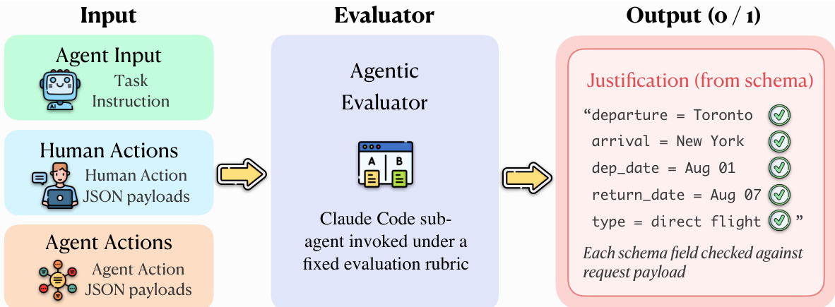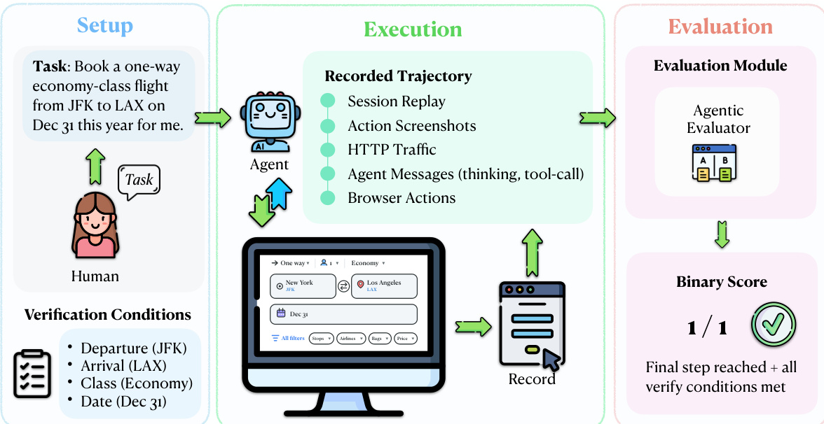 The evaluation protocol operates on five synchronized evidence streams derived from both the agent and a human reference trajectory: session replay, screenshots, HTTP traffic, browser actions, and agent messages. As shown in the figure below, the evaluation module uses an Agentic Evaluator, implemented as a Claude Code sub-agent, to perform an explicit alignment between the agent and human trajectories. This evaluator receives the task instruction, the agent trajectory, and the human reference trajectory as input and applies a fixed evaluation rubric to determine task success. The evaluation process involves identifying corresponding steps, detecting divergences, verifying that required fields and actions are correct, and confirming that the agent reaches a terminal state equivalent to the human reference.