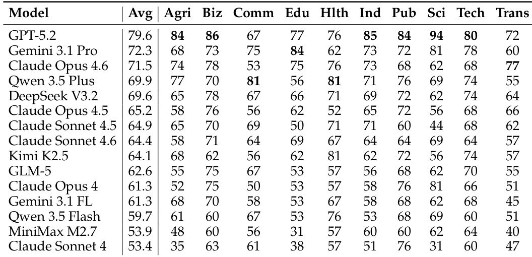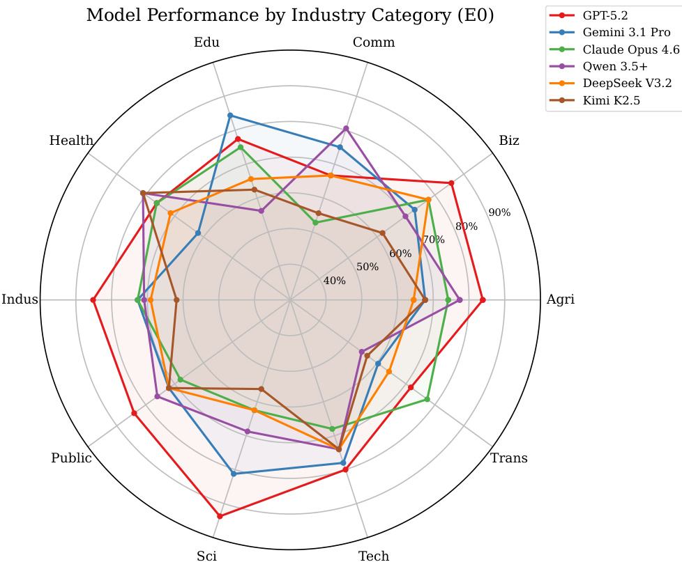The authors present a comparison of 15 models across 10 industry categories, revealing that no single model dominates all domains. Each model exhibits a distinct occupational capability profile, with performance varying significantly by industry. The the the table shows that different models excel in different sectors, such as business, education, or healthcare, highlighting the importance of selecting models based on specific industry needs rather than overall rankings. No single model performs best across all industries, showing distinct occupational specializations. Models exhibit varying strengths and weaknesses across different industry categories, such as business, education, and healthcare. The performance of models is highly dependent on the specific industry, with some models excelling in certain domains while underperforming in others.