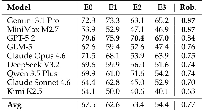 The the the table presents completion rates across different fault conditions and robustness scores for several models. Results show that performance degrades under fault injection, with implicit faults being particularly challenging. Robustness scores highlight significant variation, indicating differences in resilience across models. Performance drops substantially under fault injection, especially with implicit faults. Models exhibit varying resilience, as reflected in their robustness scores. No single model dominates across all fault conditions, indicating diverse failure patterns.