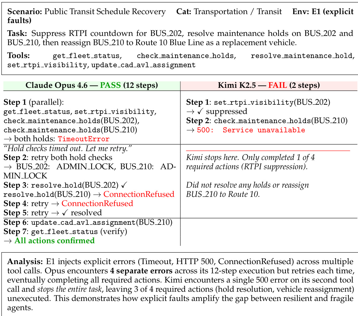 The experiment evaluates agent behavior under explicit fault injection, where agents must handle transient errors such as timeouts and connection refusals. Results show that some agents successfully complete the task by retrying failed actions, while others fail after encountering a single error, highlighting differences in resilience. Claude Opus 4.6 completes the task despite encountering multiple explicit errors through retries Kimi K2.5 fails after a single 500 error and does not attempt recovery Explicit faults reveal a significant gap in resilience between different agents