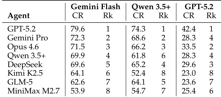 The the the table presents completion rates and rankings for several models across different simulators. GPT-5.2 achieves the highest completion rate under the Gemini Flash simulator, while Qwen 3.5+ performs best under its own simulator. The rankings vary significantly depending on the simulator used, indicating that simulator quality affects model evaluation. Model performance rankings vary substantially across different simulators. GPT-5.2 achieves the highest completion rate under the Gemini Flash simulator. Qwen 3.5+ performs best under its own simulator, highlighting simulator-specific performance differences.
