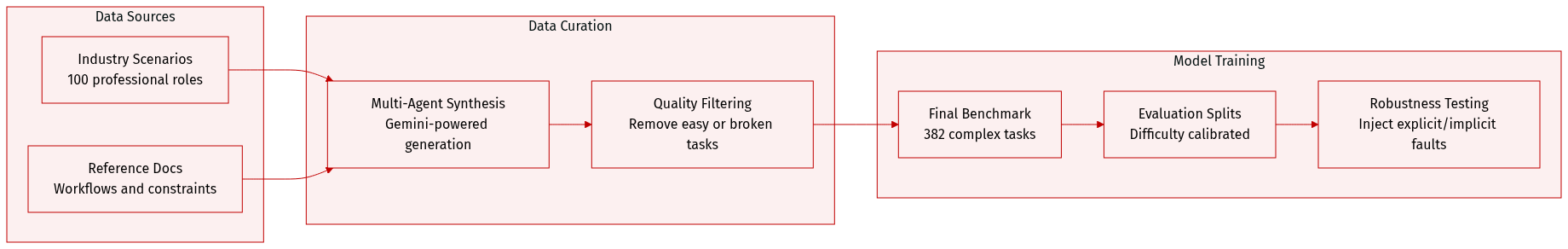 • Key Details and Filtering: Each scenario is grounded by a professional reference document covering domain terminology, workflows, and constraints. The authors applied strict filtering rules to remove tasks that were trivially easy (100% autonomous success), unsolvable (0% success), or contained invalid tool schemas. The resulting tasks are complex, averaging 5.5 tools and 16.2 tool calls per instance, and require multi-turn state transitions rather than single-step calls.