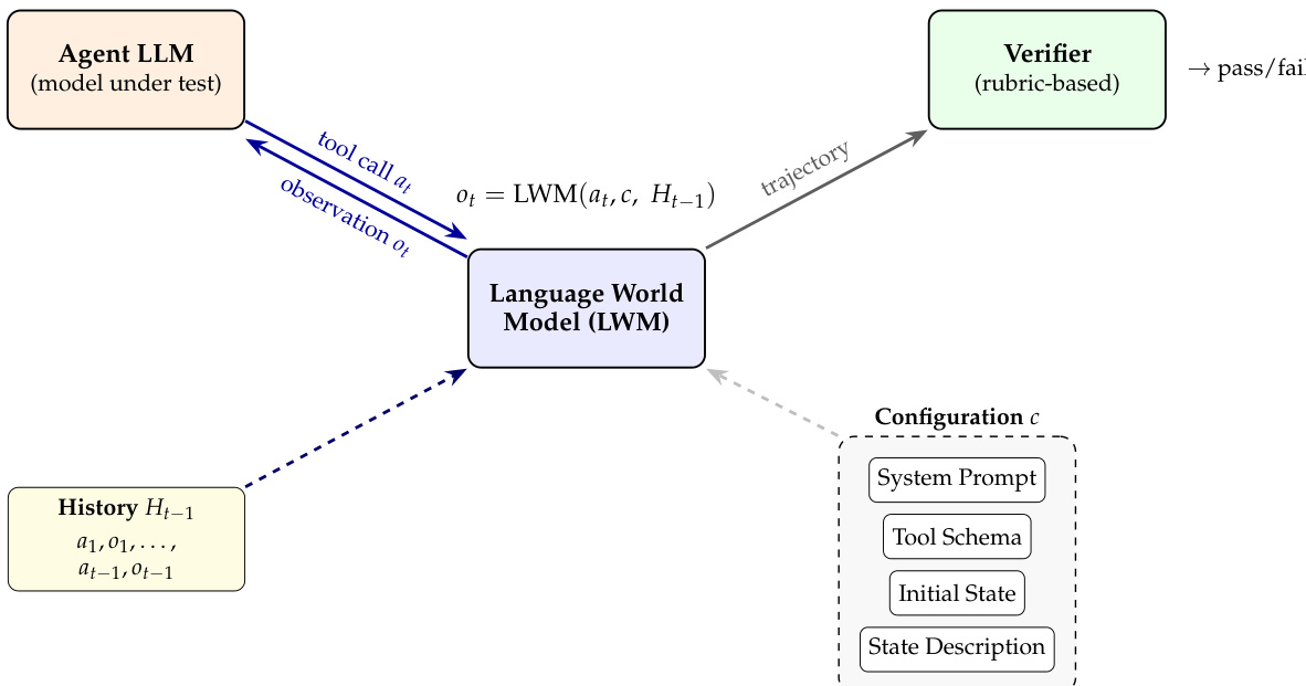 As shown in the figure below, the evaluation loop begins with an Agent LLM that issues a tool call ata_tat based on its internal reasoning and the history of prior interactions Ht1H_{t-1}Ht1. This history, which includes all previous actions and observations, is maintained in the context of the LLM and serves as input to the LWM. The LWM processes the tool call ata_tat, the environment configuration ccc, and the history Ht1H_{t-1}Ht1 to produce an observation oto_tot. The observation is then returned to the Agent LLM, allowing it to update its internal state and plan subsequent actions. The configuration ccc is external to the LWM but is provided during each interaction, ensuring that the model operates within the defined simulation constraints. The trajectory generated by this process is evaluated by a rubric-based verifier, which assesses the correctness and coherence of the agent's behavior over time. The LWM thus acts as a simulation engine that enables the agent to interact with a structured environment in a controlled and consistent manner.