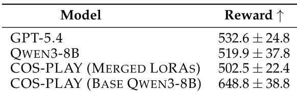 The authors compare COS-PLAY against baseline models on game environments, showing that the full COS-PLAY framework achieves higher rewards than both GPT-5.4 and a merged LoRA variant. The results indicate that the full model outperforms the base Qwen3-8B and the merged LoRA version, suggesting that the co-evolving training and specialized LoRA adapters contribute to improved performance. COS-PLAY achieves higher rewards than GPT-5.4 and the merged LoRA variant. The full COS-PLAY model outperforms the base Qwen3-8B and the merged LoRA version. The improved performance suggests the importance of the co-evolving training and specialized LoRA adapters.