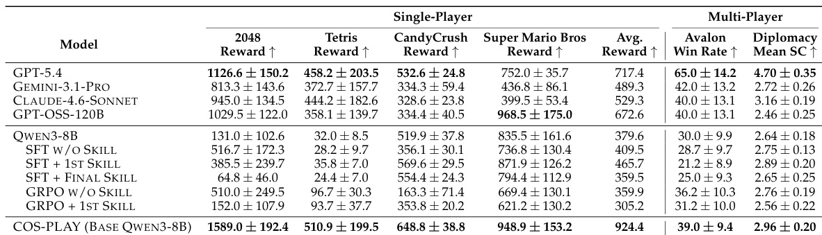 - Experiments across six diverse game environments demonstrate that the 8B base model achieves over 25.1% average reward improvement against four frontier LLM baselines in single-player benchmarks while maintaining competitiveness in multi-player social reasoning tasks.