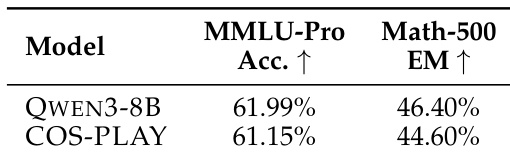 The authors evaluate COS-PLAY against a base model on general reasoning benchmarks, showing that the adapted model maintains performance close to the original while achieving strong game-playing results. Results indicate that the adaptation process preserves general reasoning ability with minimal degradation, suggesting the method does not compromise broad cognitive skills despite specialization in game environments. COS-PLAY maintains performance close to the base model on general reasoning benchmarks The adaptation process results in minimal degradation of general reasoning ability COS-PLAY preserves the base model's reasoning capabilities while improving game-specific performance