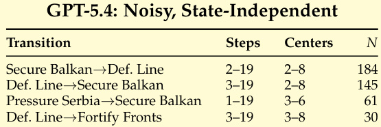 {"summary": "The authors analyze skill transitions in Diplomacy, showing how different skill categories are triggered at specific steps and center counts during gameplay. The the the table illustrates that certain transitions, such as Secure Balkan to Def. Line and Pressure Serbia to Secure Balkan, occur within defined ranges of game steps and supply centers, indicating a structured, phase-based decision process. These patterns suggest that skills are used to impose temporal structure and guide action selection, with some transitions being more frequent than others.", "highlights": ["Skill transitions in Diplomacy are triggered within specific ranges of game steps and supply centers, indicating a structured decision process.", "Certain transitions like Secure Balkan to Def. Line and Pressure Serbia to Secure Balkan occur frequently, suggesting their importance in gameplay.", "The use of skills imposes temporal structure, helping to guide action selection and prevent strategic stagnation."]