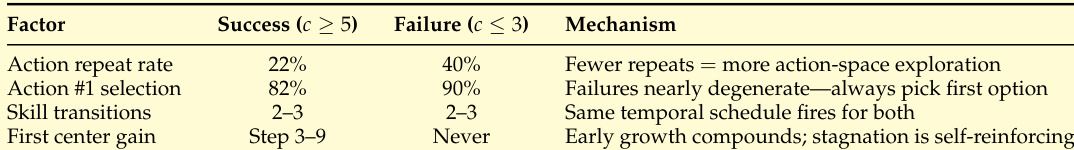 The authors analyze failure modes in Diplomacy by comparing successful and failed episodes, identifying that successful runs exhibit diverse actions and structured skill transitions, while failures are characterized by repetitive actions and lack of strategic variation. The analysis highlights that skill transitions and action diversity are critical for avoiding stagnation and enabling effective gameplay, with the framework providing a temporal structure that supports exploration and prevents collapse. Successful episodes show diverse actions and structured skill transitions, while failures are marked by high action repetition and lack of variation. The framework prevents collapse by enforcing a temporal structure that maintains a safety floor, even with poor action selection. Skill transitions impose a curriculum schedule that broadens action exploration and avoids stagnation.