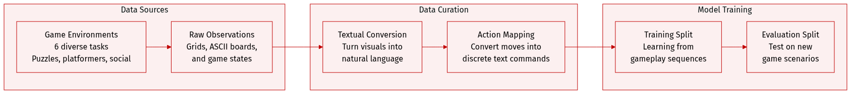 - Agents interact through discrete text actions. For Tetris, the authors use macro actions for valid placements rather than primitive controls. For Candy Crush, the action space is dynamic, consisting of valid coordinate-pair swaps.