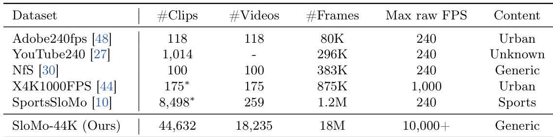 - Composition and Sources: The dataset consists of 44,632 slow-motion video clips totaling 18 million frames. The raw video material is sourced from YouTube, Vimeo, and Flickr using queries related to high frame rates and slow motion.