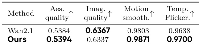 The authors present a method for video understanding and generation that leverages self-supervised signals to infer playback speed and manipulate temporal dynamics. Their approach is evaluated on tasks such as speed estimation and temporal super-resolution, with results demonstrating improved performance over baselines in both quantitative and perceptual metrics. The model achieves strong alignment with human perception, particularly in generating realistic slow-motion videos and enhancing low-frame-rate footage. The proposed method achieves higher perceptual quality and motion smoothness compared to the baseline in video generation tasks. Results show that the model generates videos with more accurate speed controllability and temporal consistency. The model outperforms baselines in both image quality and flicker reduction, indicating superior temporal coherence.