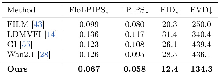 The authors evaluate their method for temporal super-resolution against several baselines, focusing on both clean and motion-blurred inputs. Results show that their approach achieves superior performance across multiple metrics, particularly in handling motion blur and producing high-quality, temporally consistent outputs. The method consistently outperforms existing models, demonstrating its effectiveness in reconstructing fine-grained motion details under challenging conditions. The proposed method significantly outperforms existing baselines in temporal super-resolution, especially under motion blur. It achieves the best results across multiple evaluation metrics, including FID and FVD, indicating high-quality reconstruction. The approach demonstrates robustness in generating sharp, coherent frames even from heavily blurred inputs.