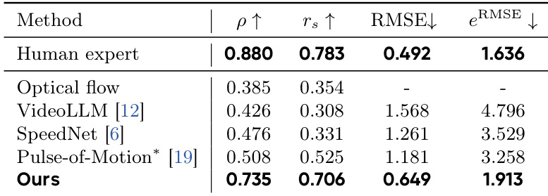 The authors evaluate a model for playback speed prediction against several baselines, including human experts and existing methods. Results show that the proposed method achieves performance close to human experts, significantly outperforming other models in correlation and accuracy metrics, while demonstrating robustness in estimating speed across diverse video conditions. The proposed method achieves performance close to human experts in playback speed prediction, outperforming existing models in correlation and error metrics. The model significantly improves upon baselines like VideoLLM and SpeedNet, narrowing the gap between machine and human performance. The method demonstrates strong robustness and accuracy in estimating video speed, particularly in challenging scenarios with motion blur and extreme temporal scales.