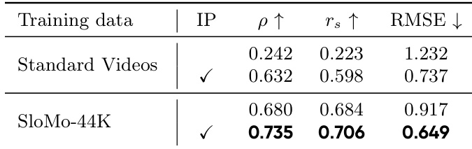 The authors evaluate the impact of training data on playback speed prediction, comparing models trained on standard videos versus those trained on their large-scale slow-motion dataset, SloMo-44K. Results show that models trained on SloMo-44K achieve significantly better performance across all metrics, including correlation coefficients and error measures, indicating superior speed estimation accuracy. Models trained on SloMo-44K outperform those trained on standard videos across all speed prediction metrics. Training on SloMo-44K leads to higher correlation with ground truth and lower prediction error. The improvement is consistent across both linear and rank-based correlation measures.