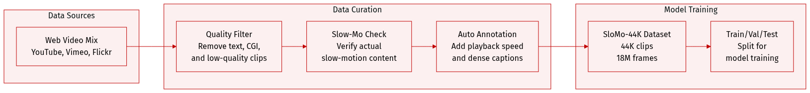 - Slow-Motion Identification: To prevent the dataset from being dominated by standard speed content, the authors use a two-stage filtering process. This combines a VideoLLM (Gemini) to localize slow-motion segments with a fine-tuned ViT-based classifier (VideoMAEv2) trained on human-annotated clips. A clip is only retained if it meets strict thresholds from both models.