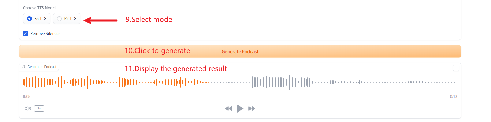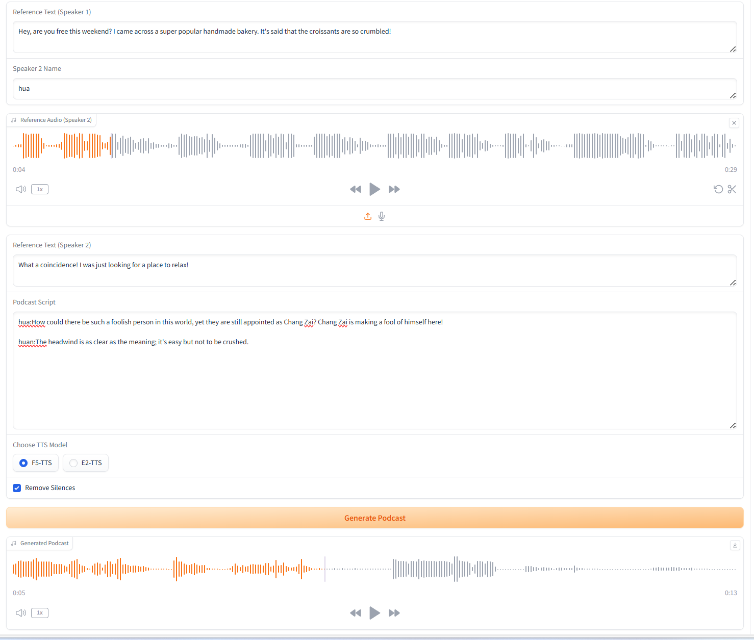 - Remove Silences: The model tends to produce silence, especially on longer audio. We can remove silence manually if needed. Please note that this is an experimental feature and may produce strange results. This will also increase generation time.