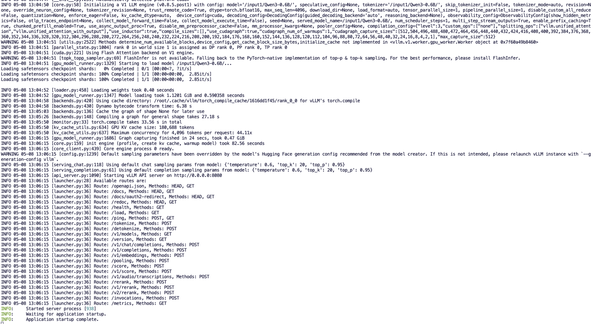 python3 -m vllm.entrypoints.openai.api_server --model /input1/Qwen3-0.6B/ --host 0.0.0.0 --port 8080 --dtype auto --max-num-seqs 32 --max-model-len 4096 --tensor-parallel-size 1 --trust-remote-code