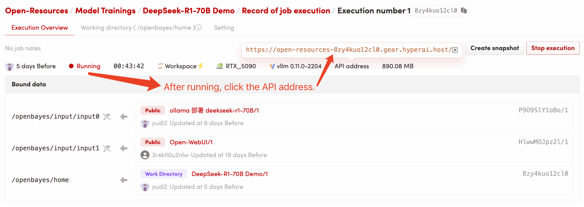 1. After starting the container, click the API address to enter the web interface (if "Bad Gateway" is displayed, it means the model is initializing. Since the model is large, please wait about 5 minutes and try again.) 2. After entering the web page, you can start a conversation with the model!