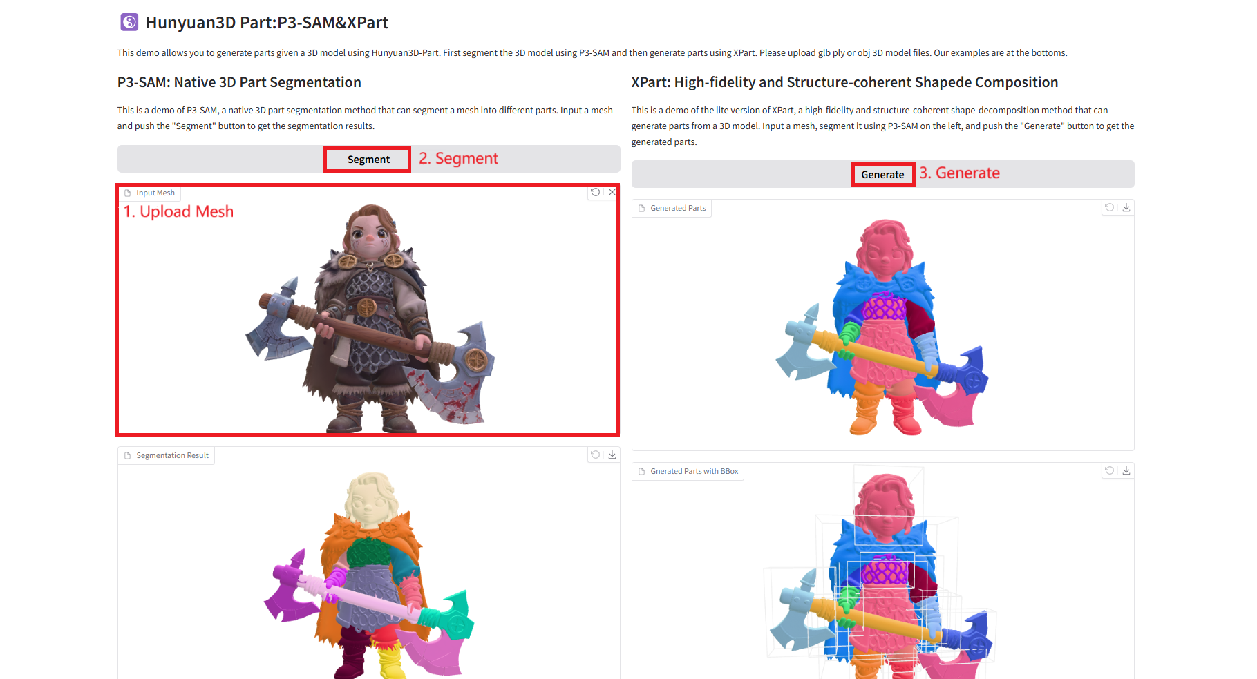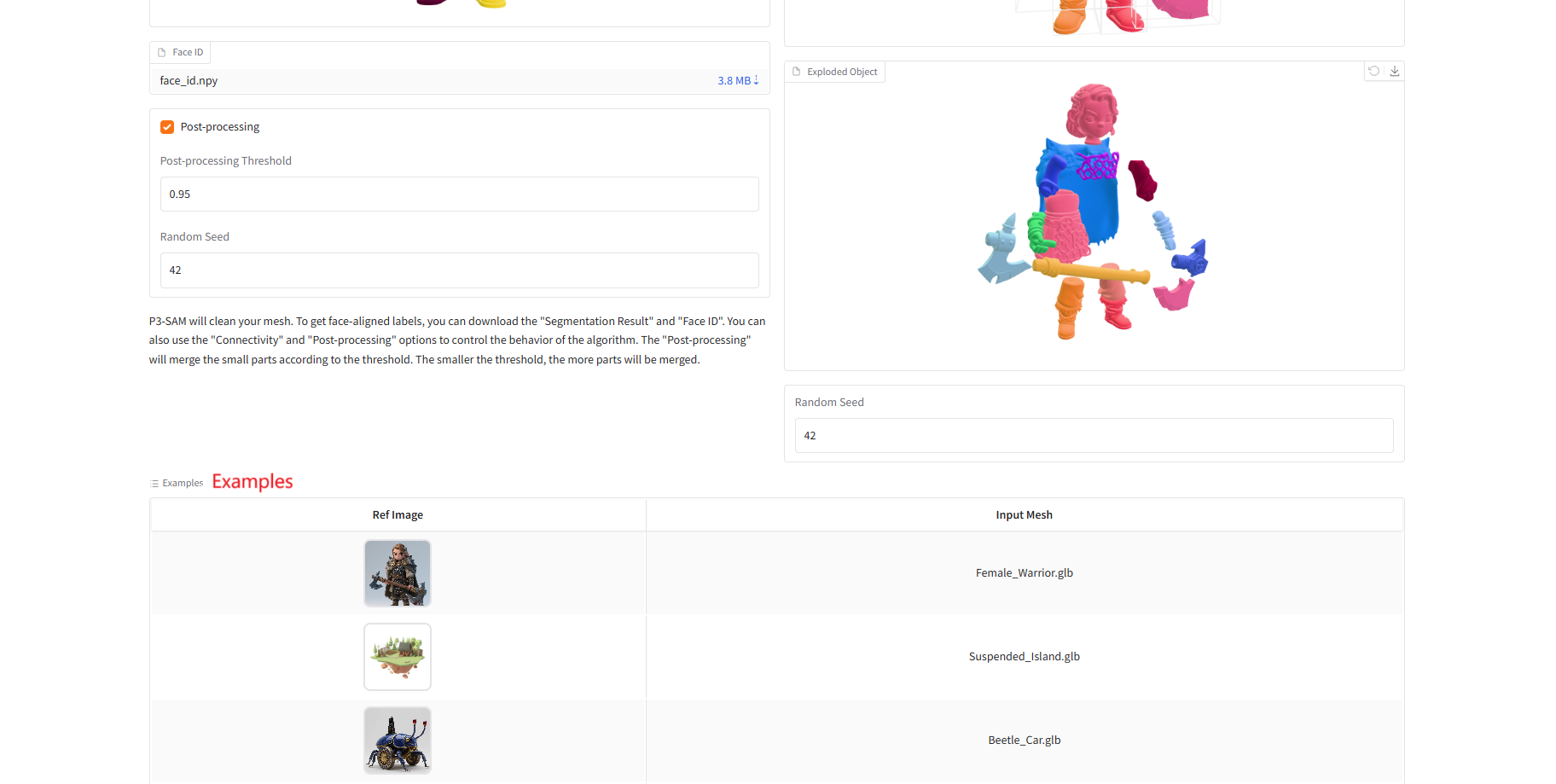 - Random Seed: Controls the randomness involved in the P3-SAM segmentation process (such as sampling points, color assignment, etc.).