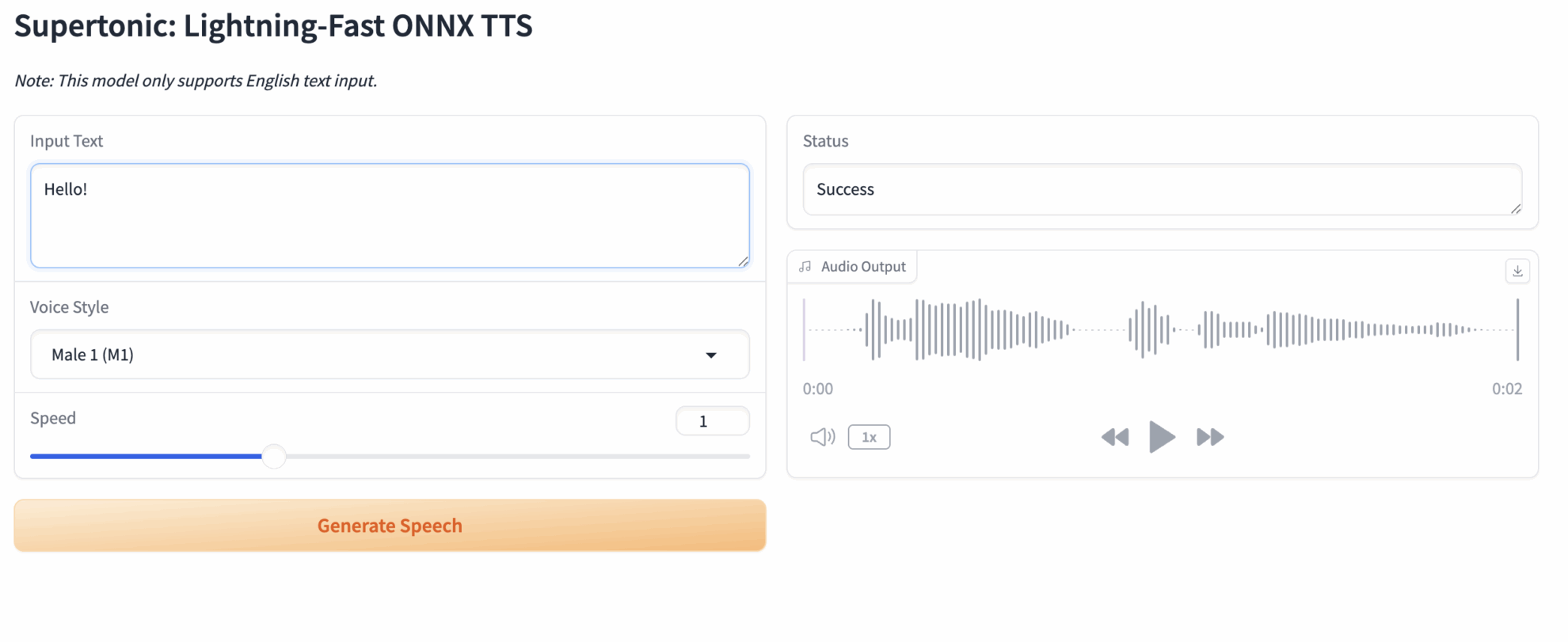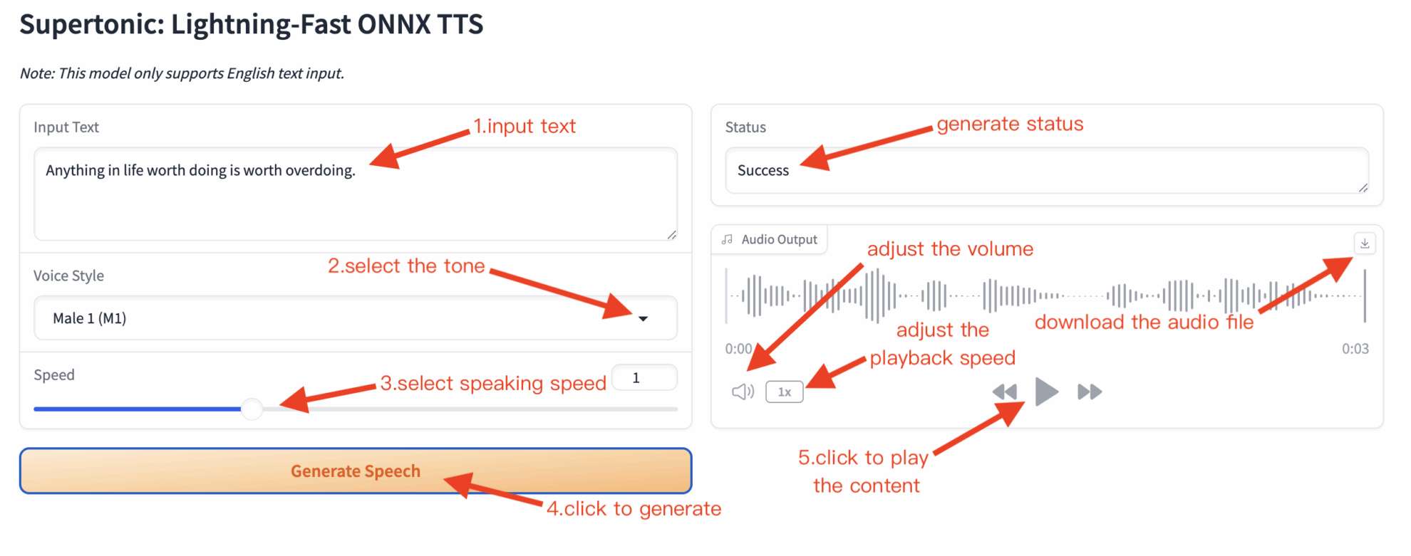 - Input Text: Enter the English text you want to synthesize in the text box on the left. Example: Supertonic is a lightning-fast text-to-speech model.