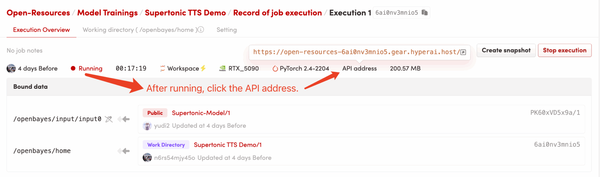 dependencies.shThe CUDA environment will be configured automatically and the model will be loaded. Since core dependencies are pre-installed, this process is very fast, usually taking only 1-2 minutes. - Accessing the application: After the container status changes to "Running", click the "API Address" button in the upper right corner of the container details page to open the Grado web interface.
